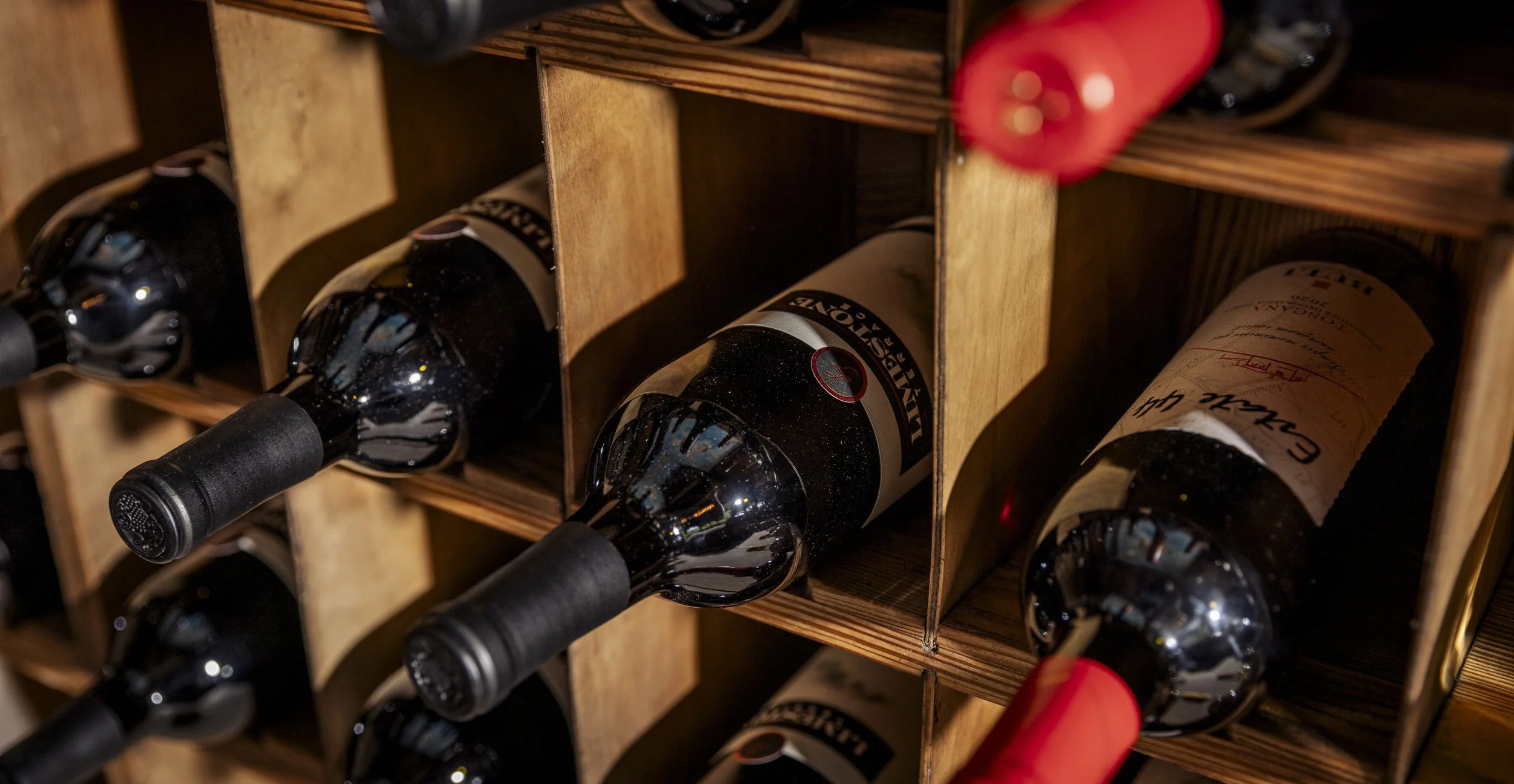 Several bottles of wine stored horizontally in a wooden wine rack, with one bottle having a red foil cap.