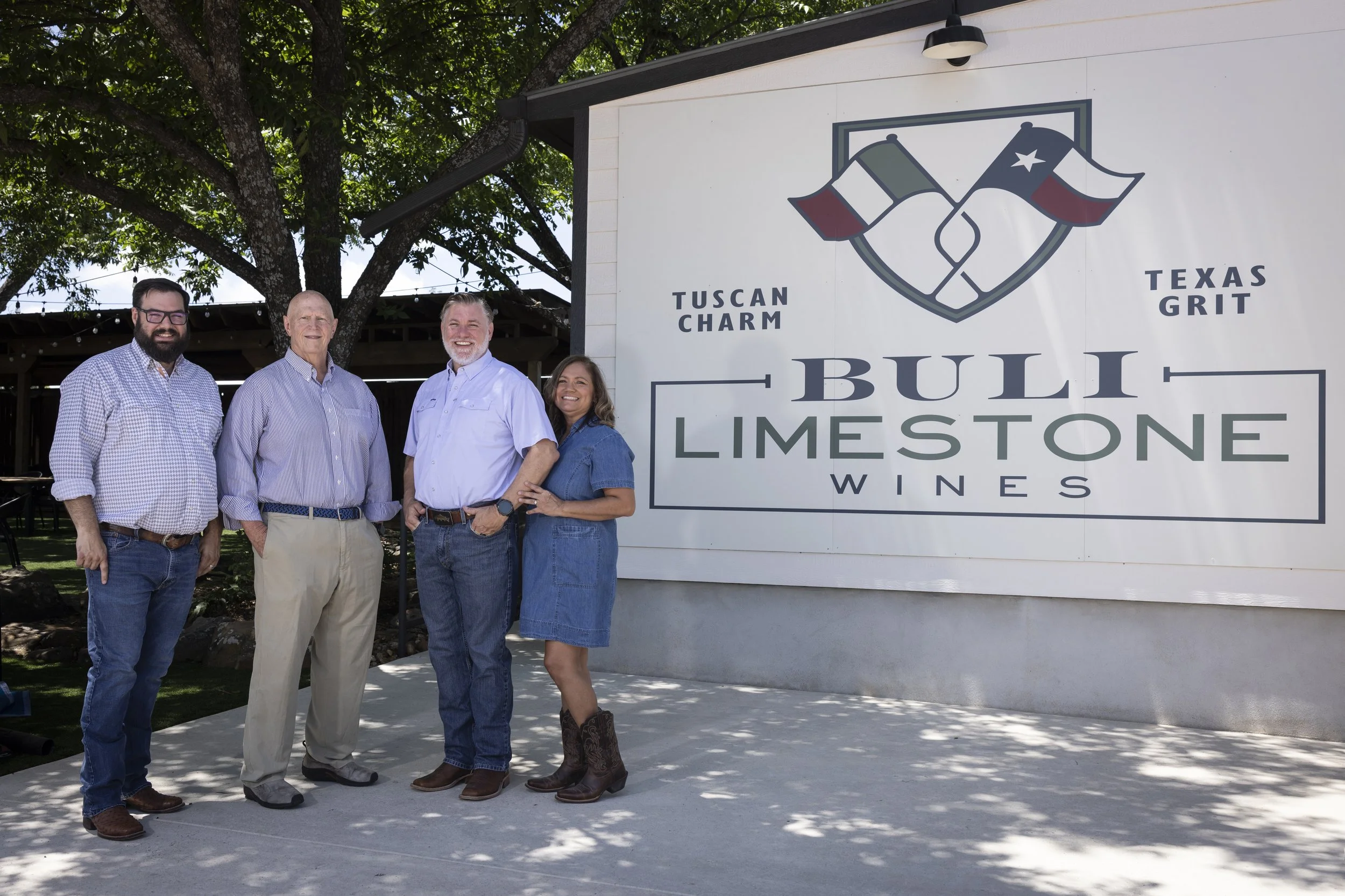 Four people standing outside in front of a large sign for Bull Limestone Wines, which features a logo with two crossed flags and text indicating themes of Texas charm and grit.